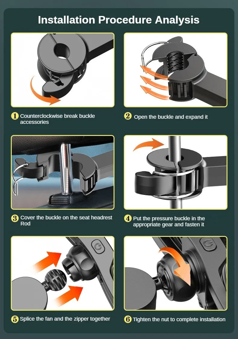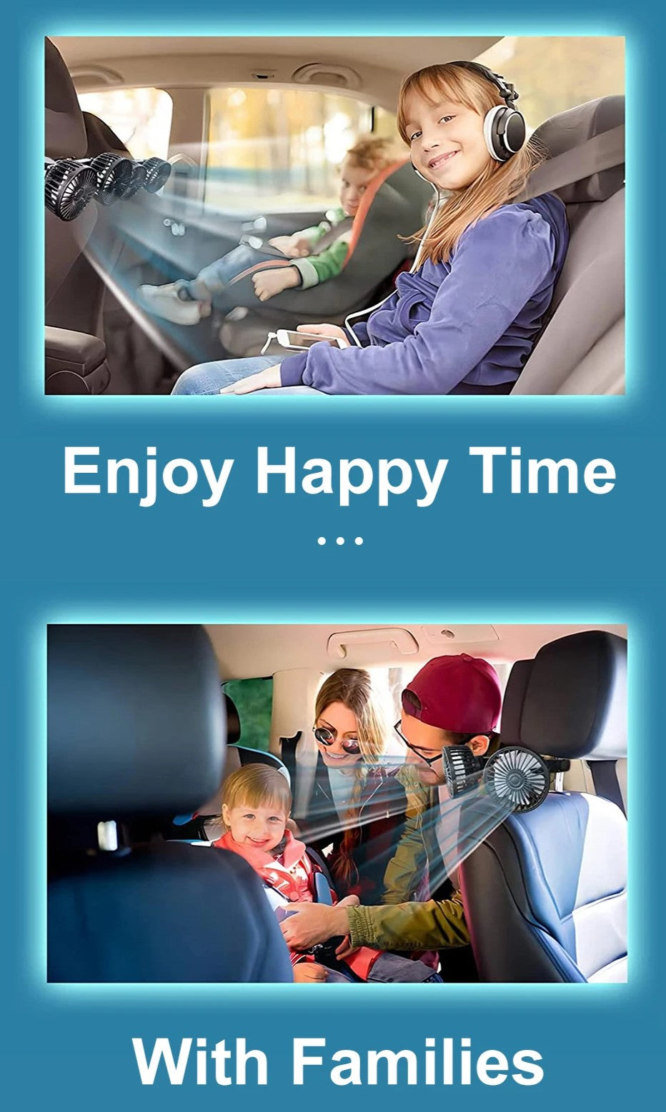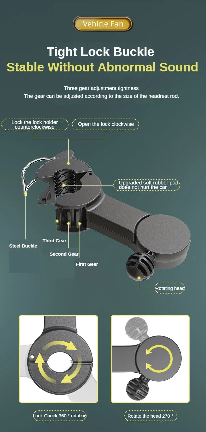 1.FLEXIBLE MULTI ANGLE AIR FAN: Adjustable silicone hose for flexible installation. Easily folds and twists for precise airflow. Strong buckle ensures secure placement on headrest