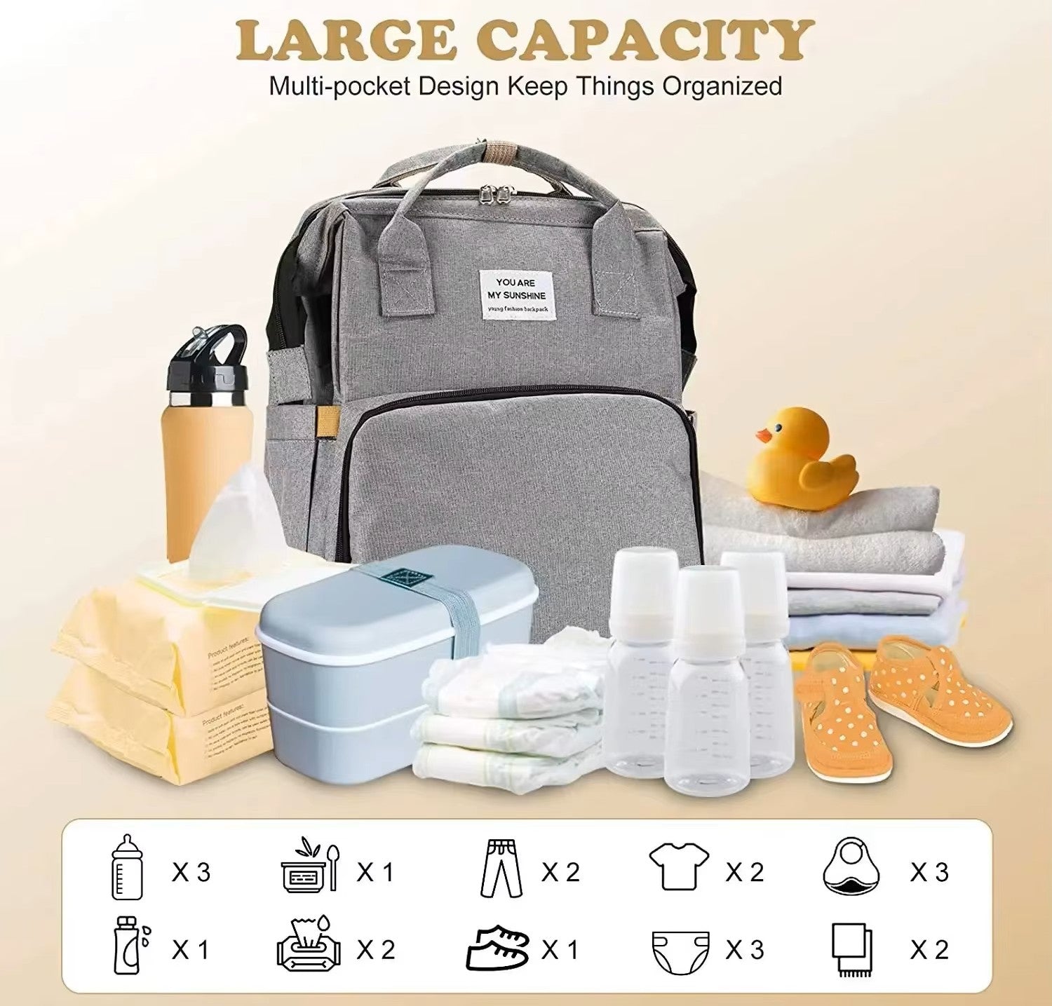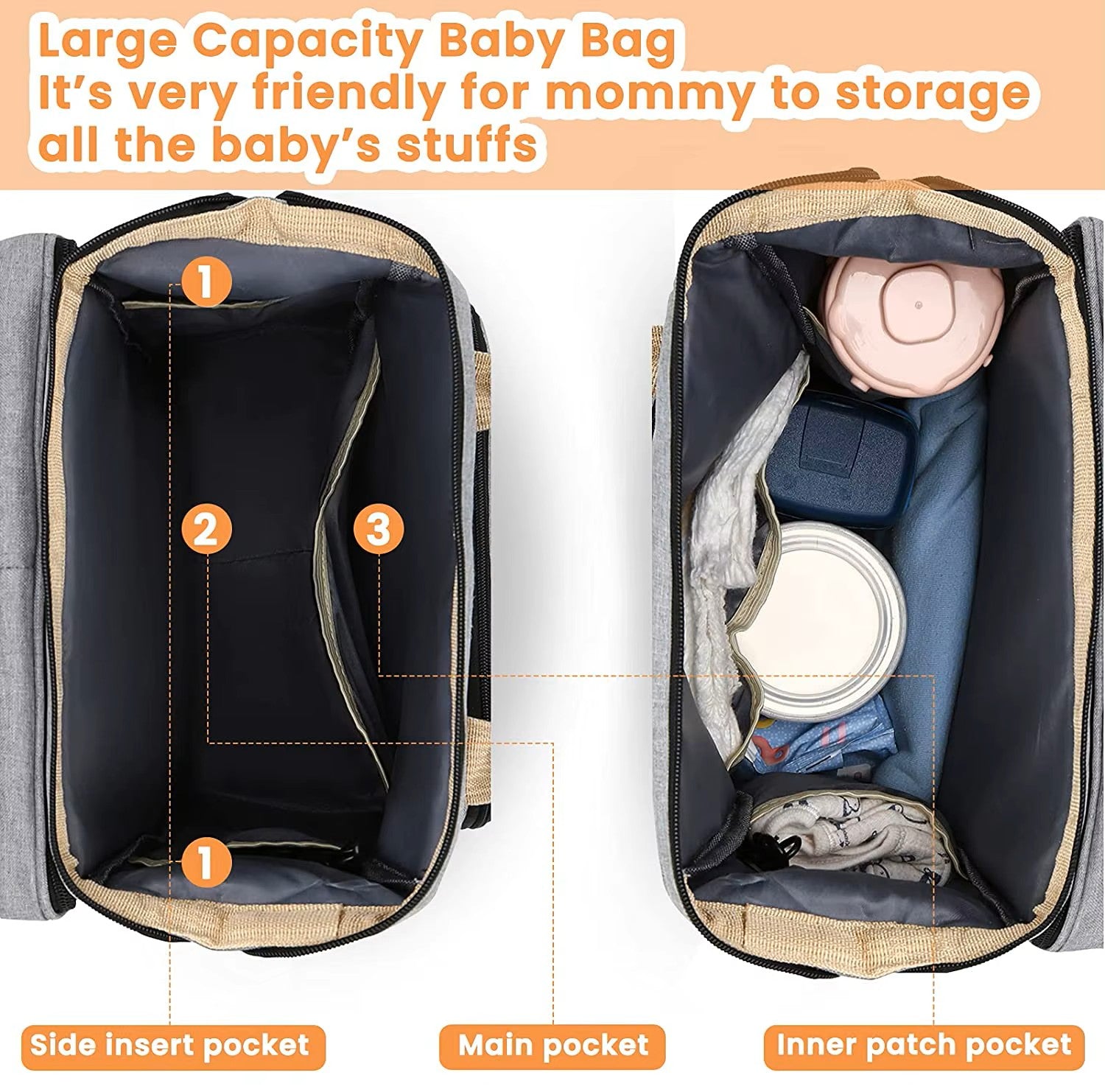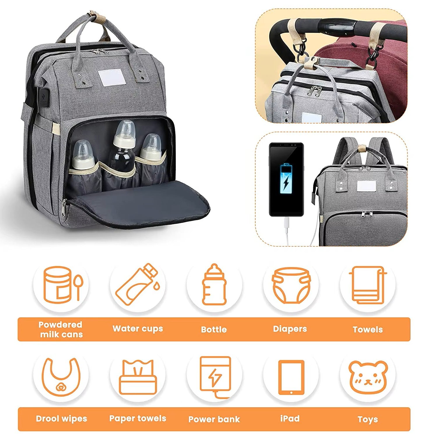 Stores Essentials: Room for nappies, bibs, and baby items, plus phone, wallet, keys, and power bank for parents.